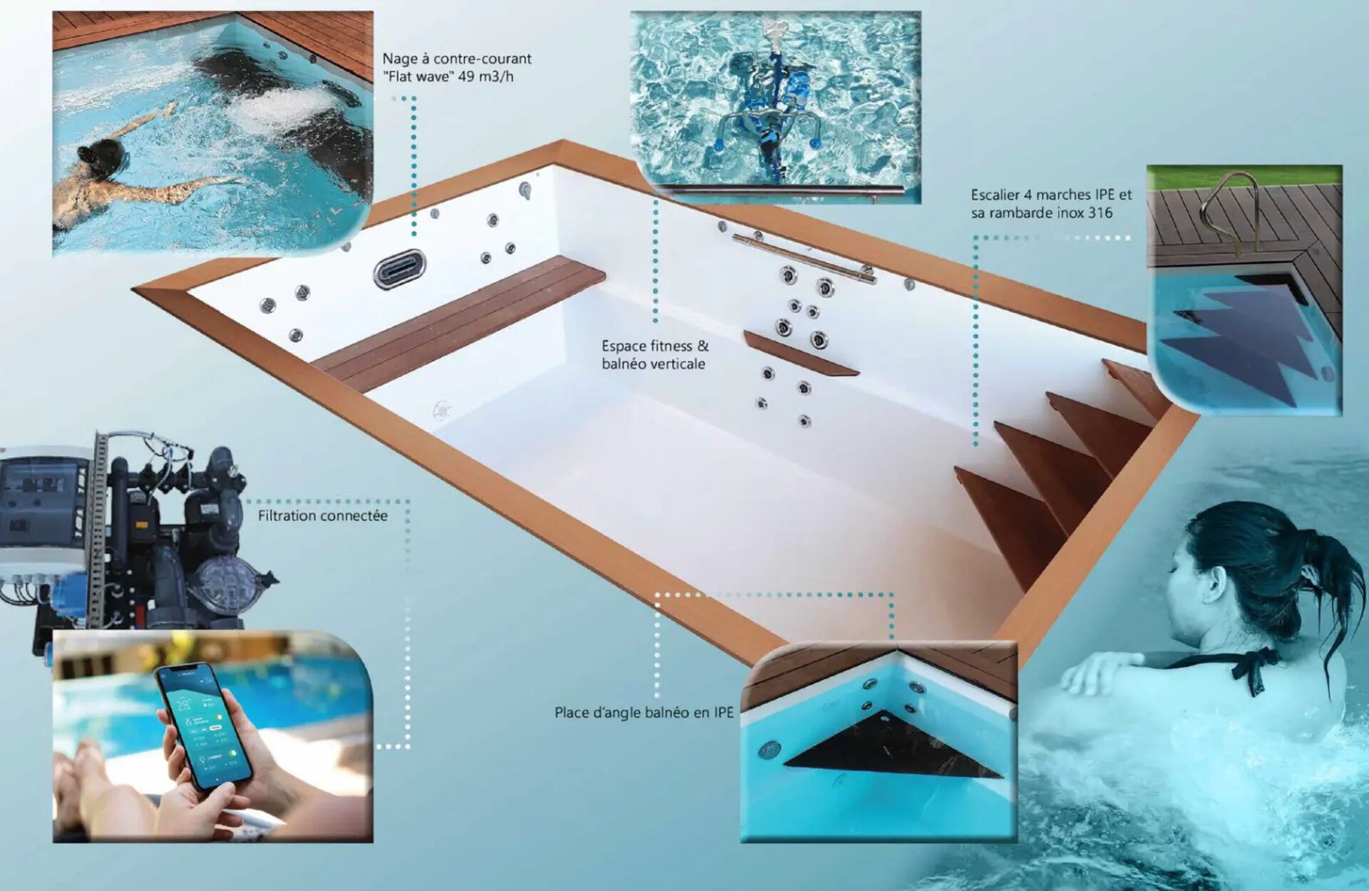 Vous rêvez de nager ou de marcher à contre-courant dans votre propre piscine ? La Novas R Sport Line est là pour vous aider à vous dépenser et à atteindre vos objectifs. Grâce à son équipement de pointe, elle vous permettra de pratiquer la natation et diverses activités sportives aquatiques. Et pour vos moments de détente, elle offre également une partie balnéo de qualité.